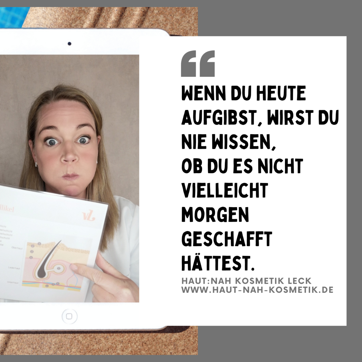 „Wenn Du heute aufgibst, wirst Du nie wissen, ob Du es nicht vielleicht morgen geschafft hättest.“ Die meisten Dinge brauchen etwas Zeit. Besonders die, die nicht in kurzer Zeit entstanden sind. Auch Hautpflege bzw. Hautverbesserung braucht seine Zeit. Jede Haut ist ein Unikat und ich kann nicht versprechen, wie lange das dauert. Ich berate Dich gerne, wenn es um vereinfachte …